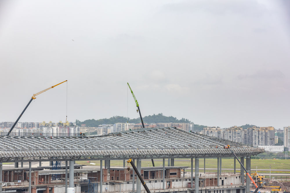 2023年4月29日,工作人員在重慶江北國際機場(chǎng)T3B航站樓施工現場(chǎng)進(jìn)行屋面施工。新華社記者 黃偉 攝