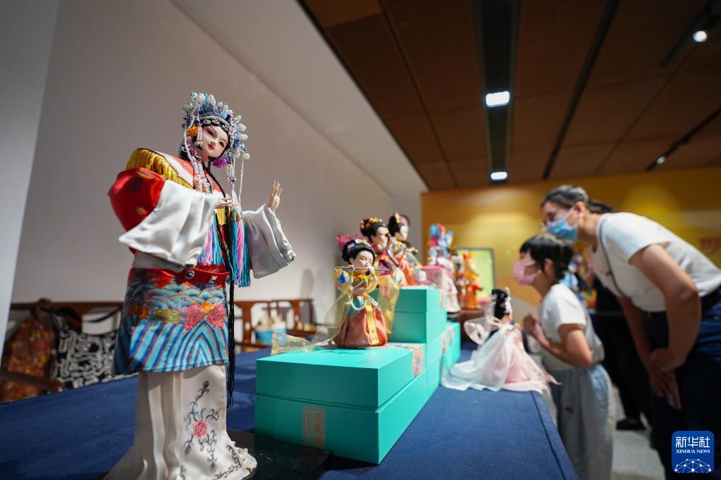 觀(guān)眾在中國工藝美術(shù)館觀(guān)看北京絹人工藝品(2022年9月10日攝)。新華社記者 陳鐘昊 攝