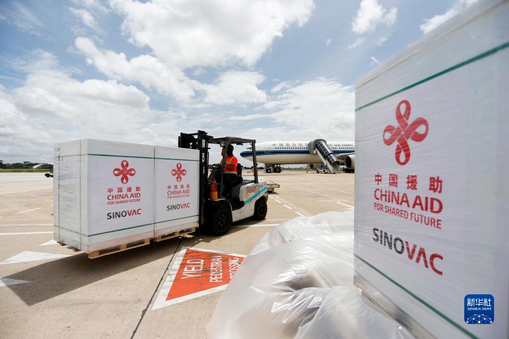 工作人員在柬埔寨金邊國際機場(chǎng)運輸中國政府援助柬埔寨的科興新冠疫苗(2021年10月14日攝)。新華社發(fā)(批隆 攝)