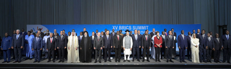 當地時(shí)間8月23日上午,金磚國家領(lǐng)導人第十五次會(huì )晤在約翰內斯堡杉藤會(huì )議中心舉行。南非總統拉馬福薩主持會(huì )晤。中國國家主席習近平、巴西總統盧拉、印度總理莫迪和俄羅斯總統普京(線(xiàn)上)出席。這是會(huì )晤期間,五國領(lǐng)導人集體合影。新華社記者 李學(xué)仁 攝