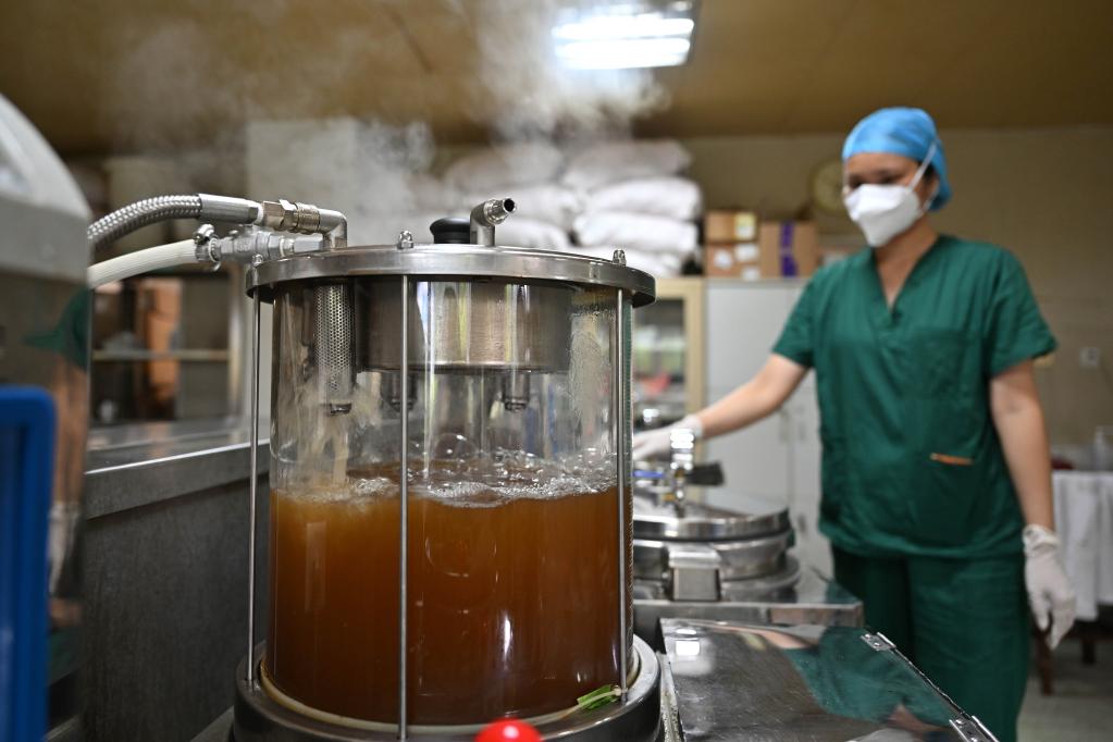 2022年8月20日,工作人員在海南省三亞市中醫院煎煮中藥,助力海南抗疫。新華社記者 郭程 攝