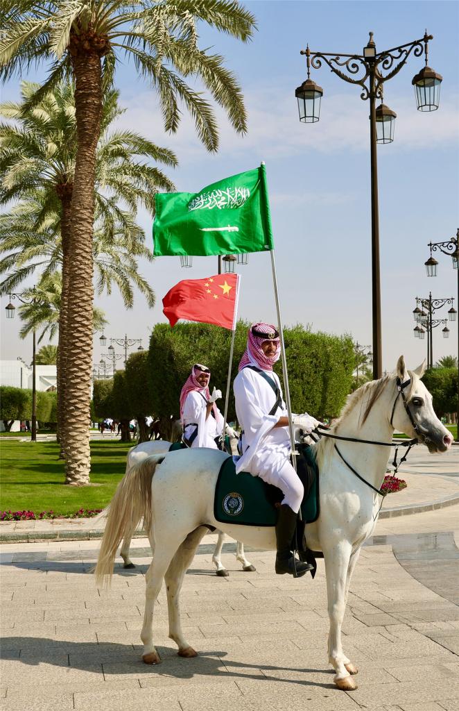 習近平在穆罕默德王儲陪同下檢閱王宮儀仗隊。沙特王宮衛隊以傳統執劍禮儀向習近平表示最隆重歡迎。