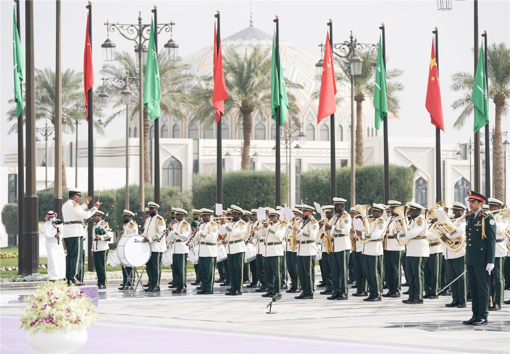 沙特王儲兼首相穆罕默德在下車(chē)處熱情迎接。兩國領(lǐng)導人步入檢閱亭,王宮軍樂(lè )團奏中沙兩國國歌。