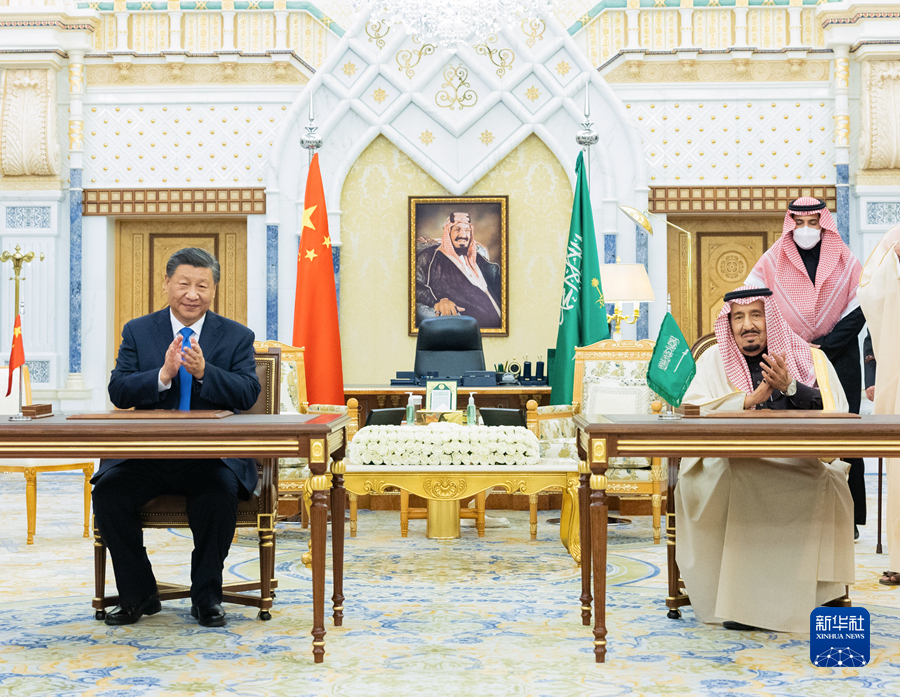 當地時(shí)間12月8日下午,國家主席習近平在利雅得王宮會(huì )見(jiàn)沙特國王薩勒曼。這是兩國元首親自簽署《中華人民共和國和沙特阿拉伯王國全面戰略伙伴關(guān)系協(xié)議》,同意每?jì)赡暝趦蓢喠髋e行一次元首會(huì )晤。新華社發(fā)