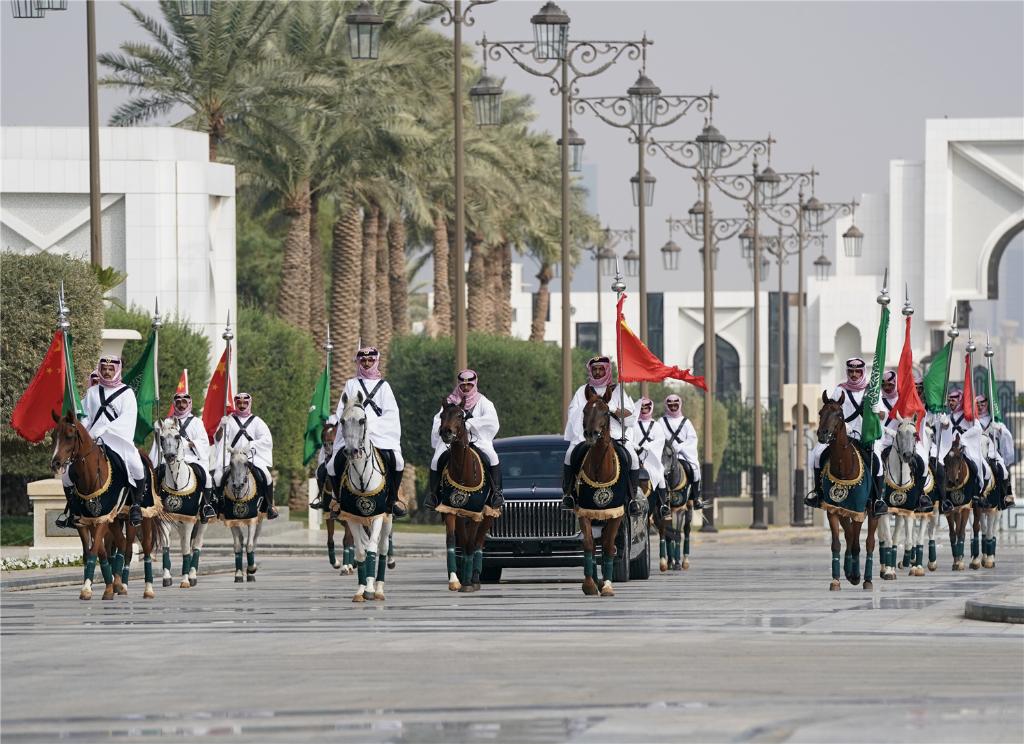 沙特王宮摩托車(chē)隊和馬隊護衛習近平專(zhuān)車(chē)抵達,沙特王儲兼首相穆罕默德在下車(chē)處熱情迎接,習近平在穆罕默德王儲陪同下檢閱王宮儀仗隊,沙特王宮衛隊以傳統執劍禮儀向習近平表示最隆重歡迎。