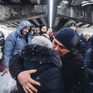 2022年3月8日,一對情侶在烏克蘭伊爾平告別。(新華社發(fā),迭戈·埃雷拉攝)