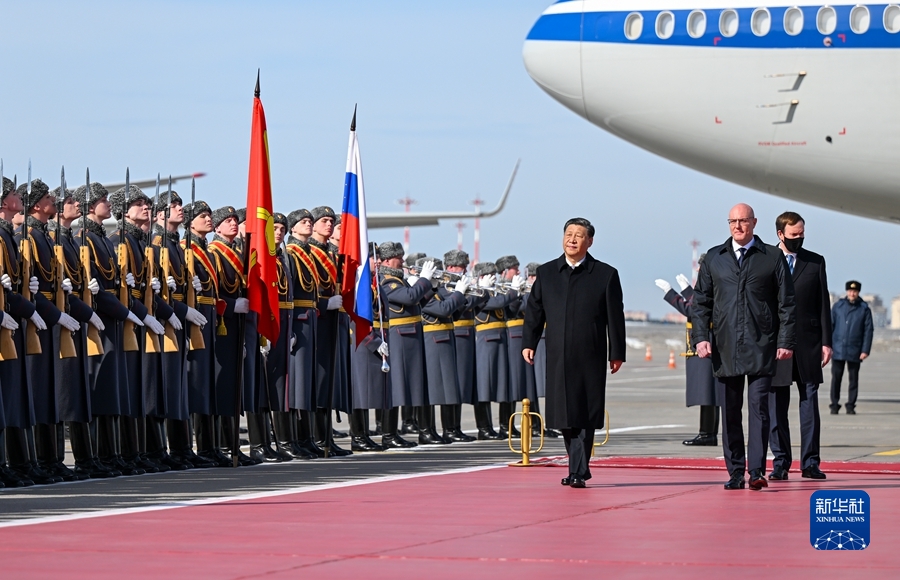 當地時(shí)間3月20日,國家主席習近平乘專(zhuān)機抵達莫斯科,應俄羅斯總統普京邀請,對俄羅斯進(jìn)行國事訪(fǎng)問(wèn)。下午1時(shí)許,習近平乘坐的專(zhuān)機抵達莫斯科伏努科沃專(zhuān)機機場(chǎng)。習近平步出艙門(mén)時(shí),俄羅斯副總理切爾內申科等政府高級官員在舷梯旁熱情迎接。俄方在機場(chǎng)舉行隆重迎賓儀式。軍樂(lè )團奏中俄兩國國歌。這是習近平檢閱俄羅斯三軍儀仗隊并觀(guān)看分列式。新華社記者 謝環(huán)馳 攝
