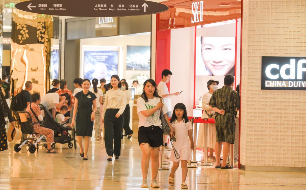 7月12日,游客在中免集團??谌赵聫V場(chǎng)免稅店選購商品。(新華社記者楊冠宇攝)
