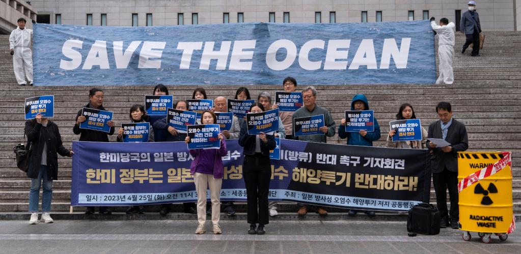 4月25日,在韓國首爾,民眾手舉標語(yǔ)抗議日本政府核污染水排海計劃。新華社發(fā)(李相浩攝)