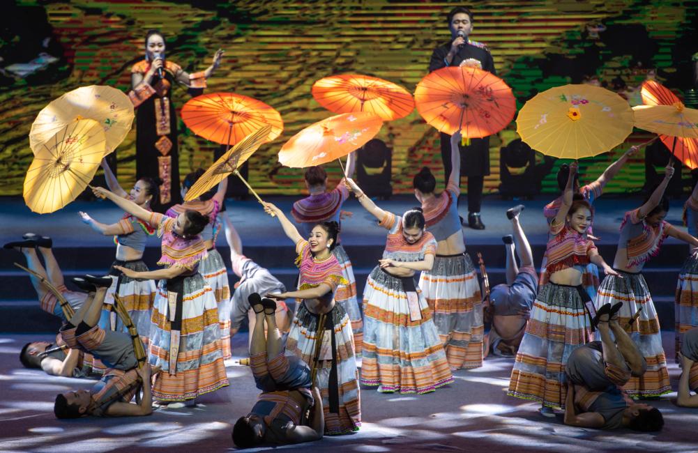 2023年1月18日,以“同心筑厚誼 攜手共發(fā)展”為主題的2023年中越跨國春節聯(lián)歡晚會(huì )在云南省紅河哈尼族彝族自治州河口瑤族自治縣舉行,越南老街省民族藝術(shù)歌舞團的演員在晚會(huì )上表演歌舞《漂浮在云端的節日》。 新華社記者胡超 攝